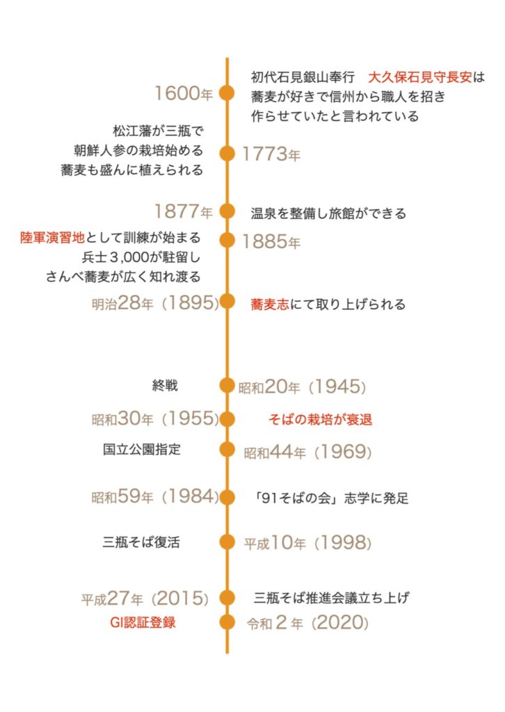 三瓶山では、安永2年(1773年)頃より、薬用人参の栽培が始まったと云われています。三瓶そばは初秋の朝夕冷え込みの激しい三瓶高原に適しており。肥沃地を好まないことから、林業が盛んだった昔は、山林伐採後に焼畑で栽培していました。 最も盛んだったのは、1877年(明治10年)頃、三瓶温泉に浴場ができ、入湯客の食膳に出されるよになりました。明治の後半になると、三瓶山は陸軍演習場となり、志学には兵舎が立ち並ぶなど、多くの人が演習で三瓶山に来るようになりました。多い時には6,000人もの人が寝泊まりし、訓練をしていたようです。三瓶そばは食堂で売り出し人気となリました。 戦後、食糧難の頃はほとんど各戸にそば畑がありましたが、昭和30年後半、食糧が豊かになったことや、農家の老齢化が進む中で、生産者が減少していきました。 国立公園指定の頃はほとんどが収量の多い信州のそばを使っており、三瓶在来種は淘汰されたかに思われました。 1998年(平成10年)頃から愛好家により三瓶そばの復活を目指した活動が行われるようになりました。その活動が広がりを見せ現在では、「三瓶そば振興協議会」となり、2020年には念願だった地理的表示制度(GI)に登録されるなど、三瓶そばを守る活動がますます盛り上がってきています。